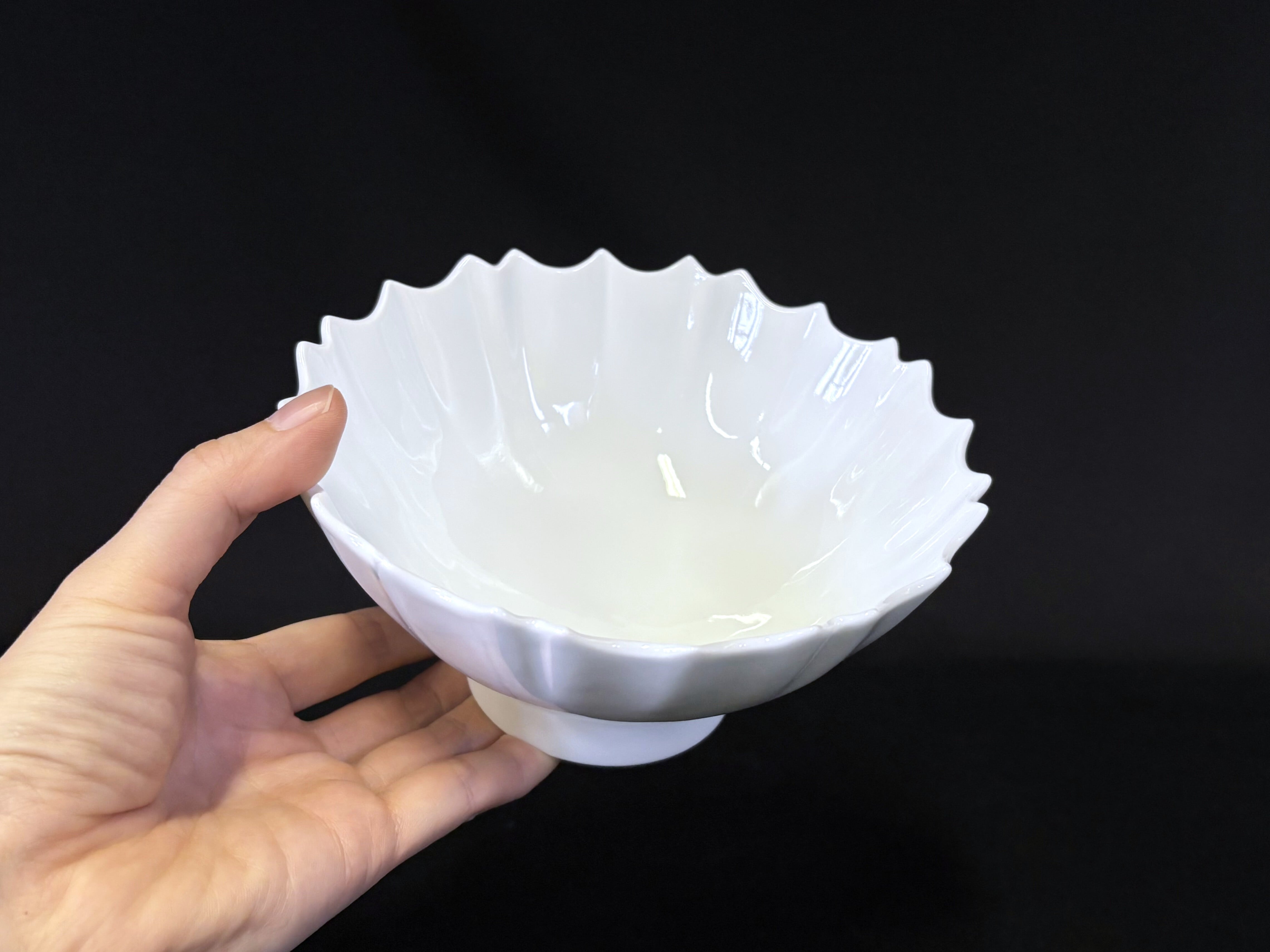 菊の花弁一枚一枚をあらわすかのような線のリズムを作り出す精緻な造形は、華やかさと静けさを併せ持った品格を感じさせます。主菜鉢としてや、また果物やサラダの盛り付けなど幅広くお使いいただけ、実用性に繊細な美しさを加えます。