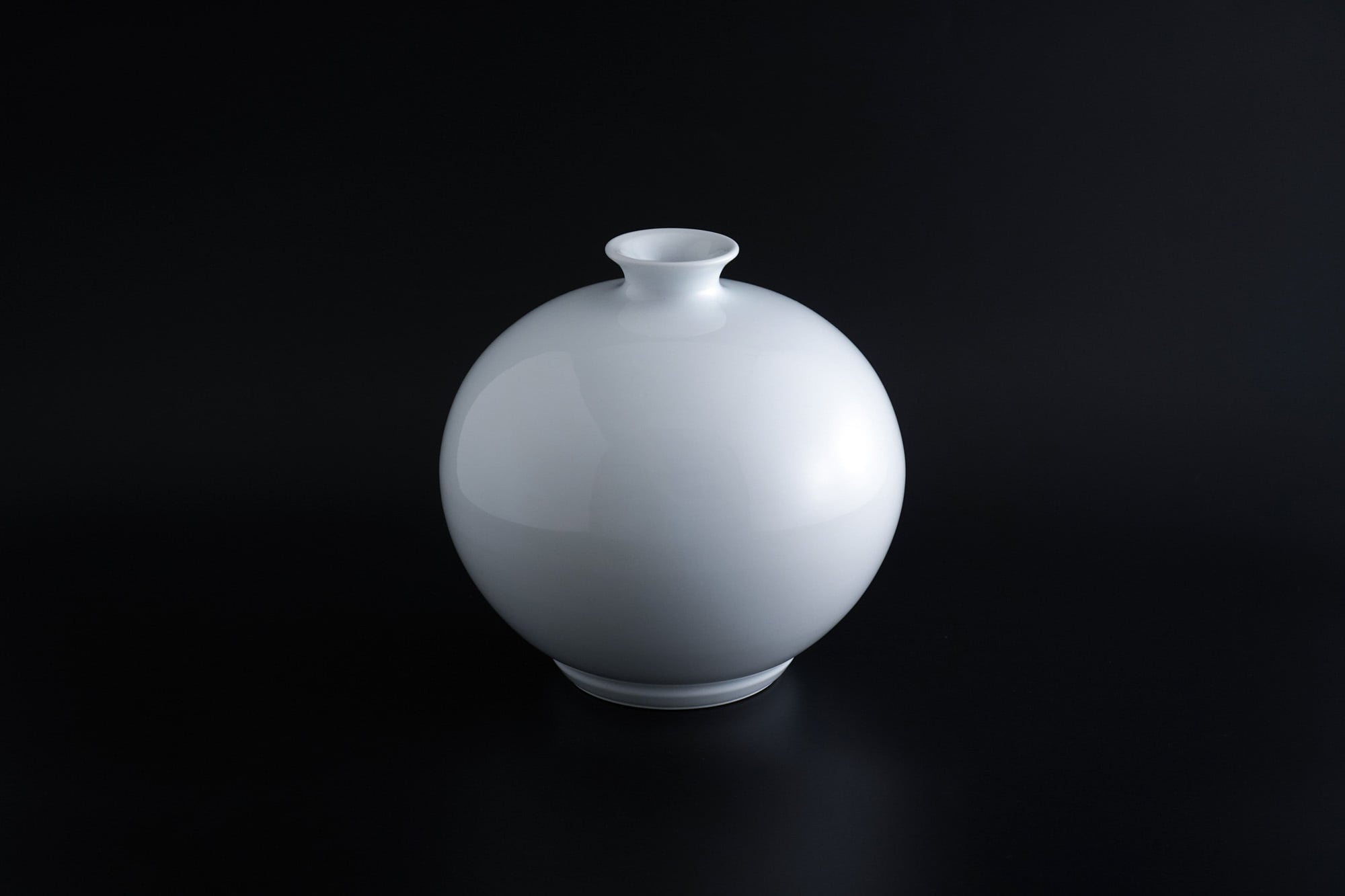 「一切の加飾をしない白磁の神髄は造形の美しさにある」というポリシーのもと、丸みの頂点や口部の開き、高さなど、すべての要素にこだわり追い求めた造形美の集大成とも言える作品です。