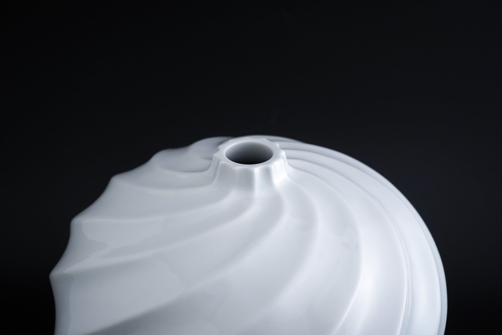 彫りの陰影が独自の雰囲気を持ち、和洋どちらのインテリアにも調和しつつ存在感のある作品です。完璧な造形の美によって、色を用いて加飾をせずとも、反射する光が集まった艶やかな輝き、表面に落ちた影、それそのものが文様のように映し出され、置く場所によって表情が変わる様子をお楽しみ頂けます。