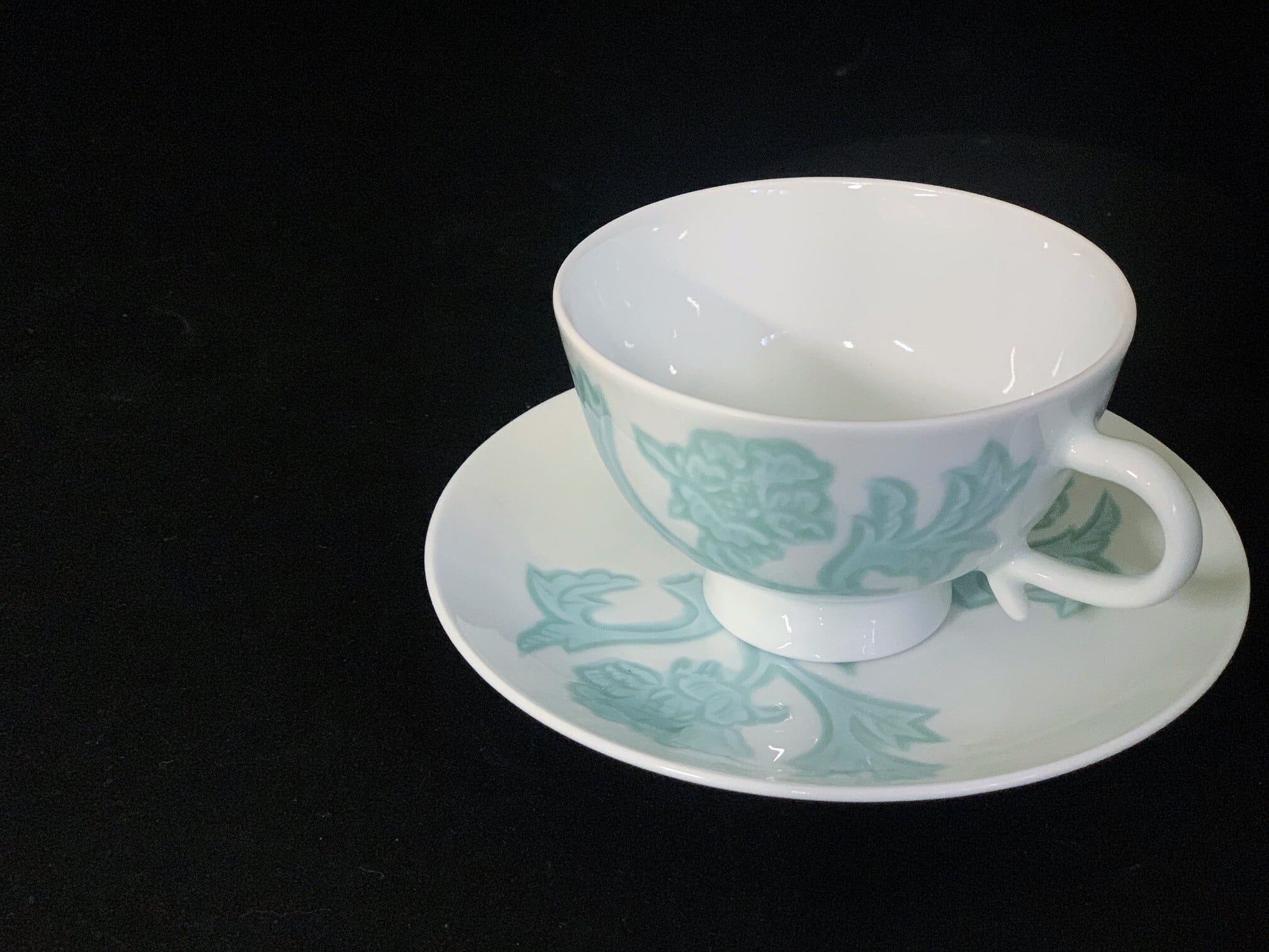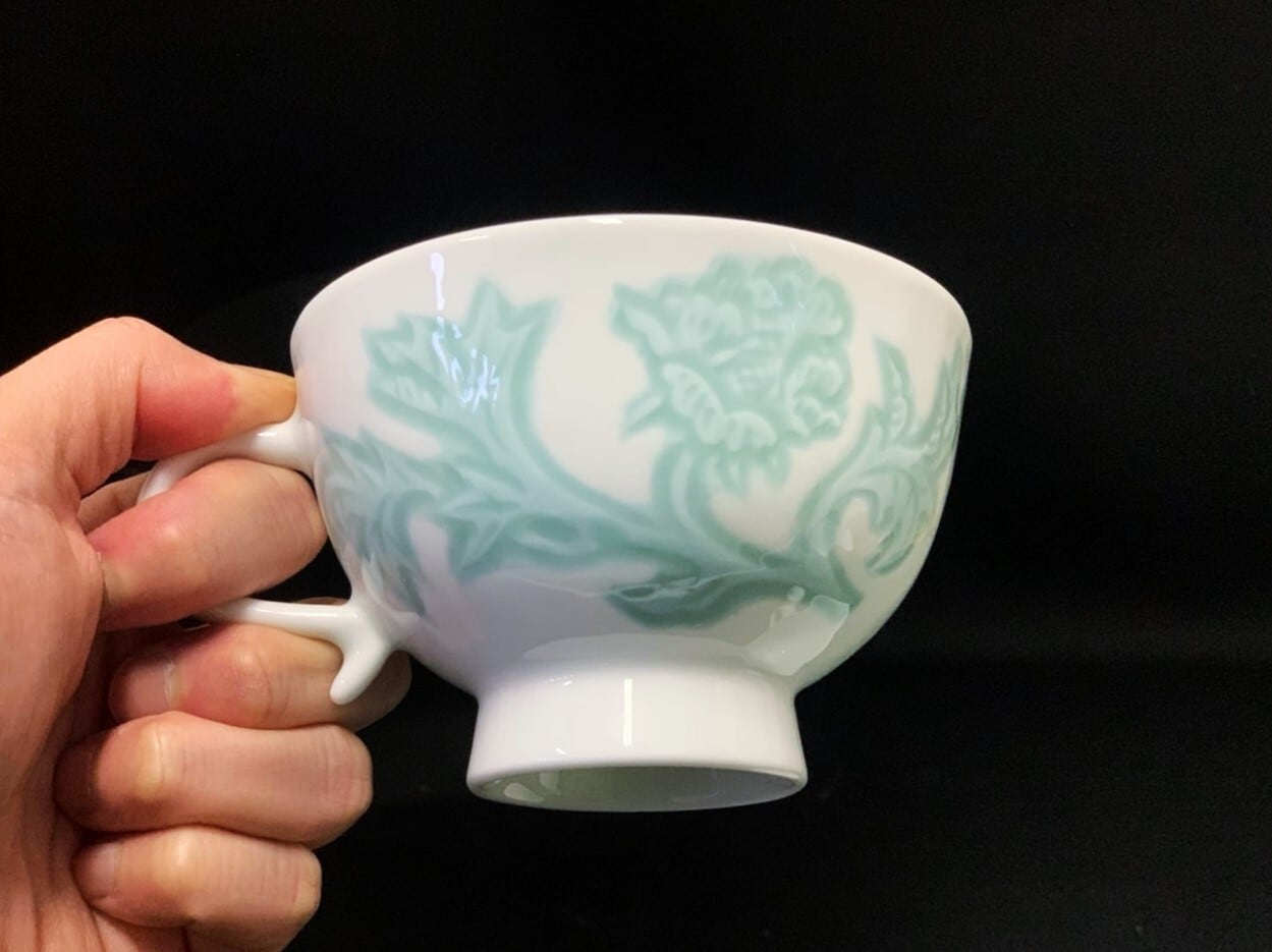 【井上萬二作】白磁緑釉牡丹彫文紅茶碗