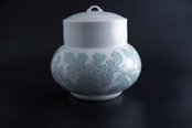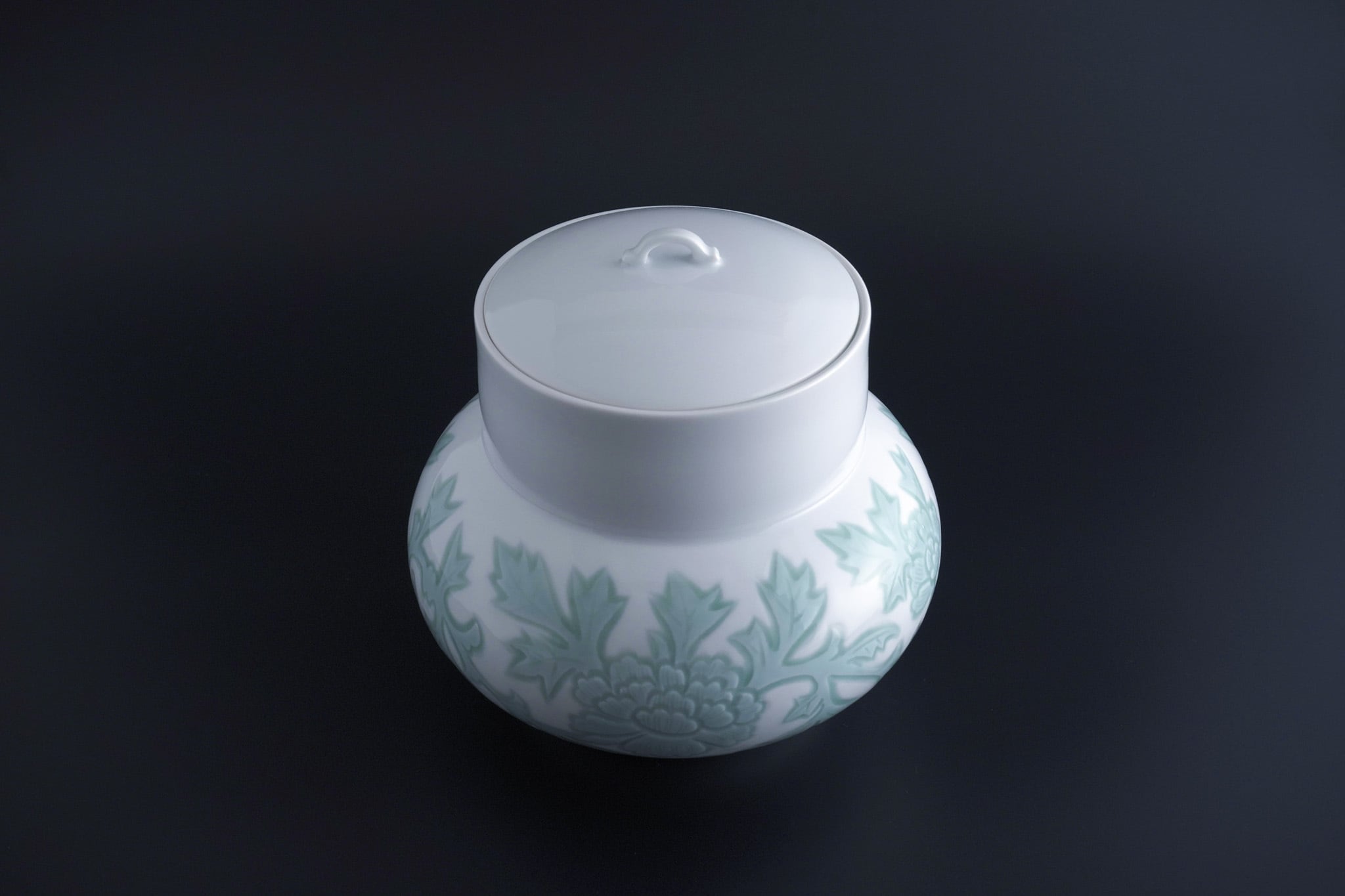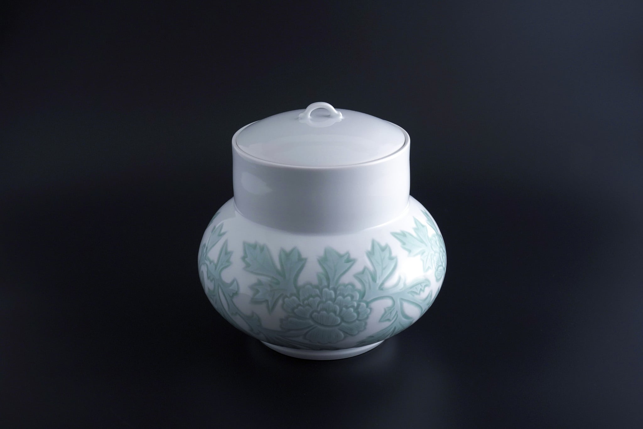 幾重にも重なる花弁が華やかで格調高い大輪の牡丹をあえて緑釉一色で優しげに仕上げた水指です。茶道のお点前の際に茶釜に水を足すためのお道具のひとつですが、どの角度から眺めても緻密に作りこまれた造形美の技術とデザインの両面をそのままインテリアとしてお楽しみ頂けます。
